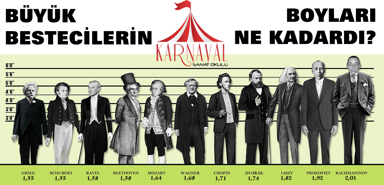 Müzik tarihinin önde gelen bestecilerinin hayatlarına ilgin pek çok şeyi biliyoruz. Peki insanlık tarihinde kendine büyük yer edinen bestecilerin acaba boyları ne kadardı hiç merak ettiniz mi? İşte aşağıdaki görsel ile bestecilerin boylarını karşılaştırmalı olarak görebiliyoruz. Bazıları beklediğimiz gibiyken bazıları gerçekten şaşırtıcı.